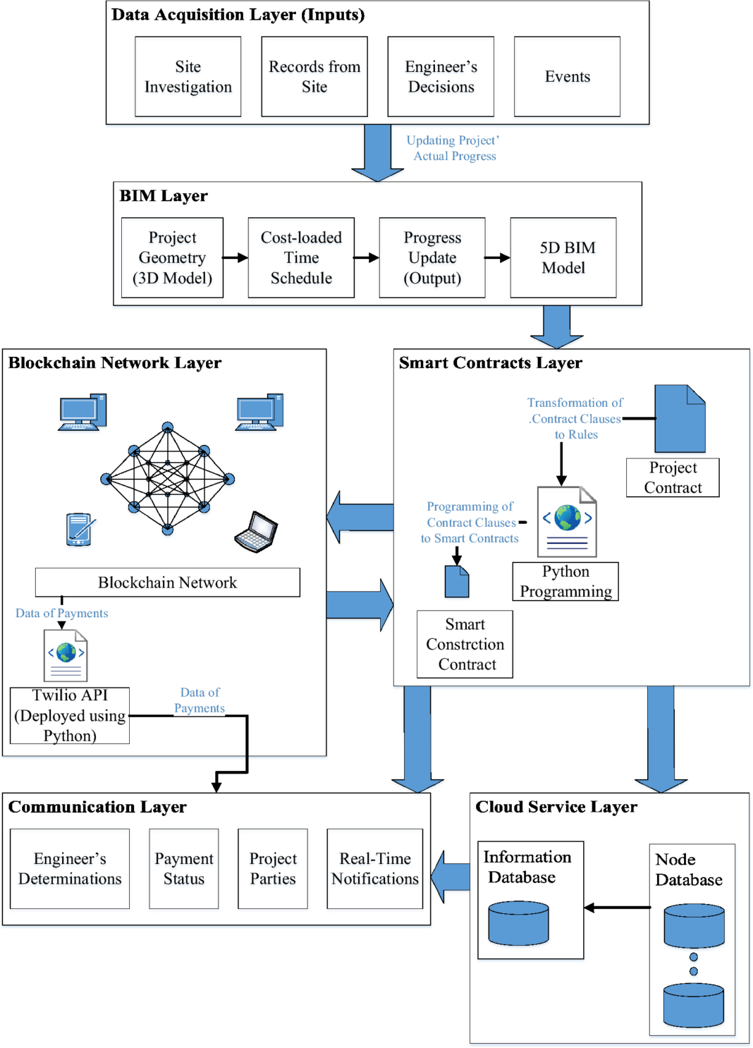 Several researchers have successfully implemented the integration of block chain, BIM and smart contracts for issuing payments to subcontractors in real construction projects in the United States and Canada. Building on these achievements, a novel framework has been proposed to enhance construction projects’ cash flow across different levels of adoption. The framework utilises smart contracts, block chain and BIM technologies to develop a smart construction contract, ensuring integrity and enforceability.