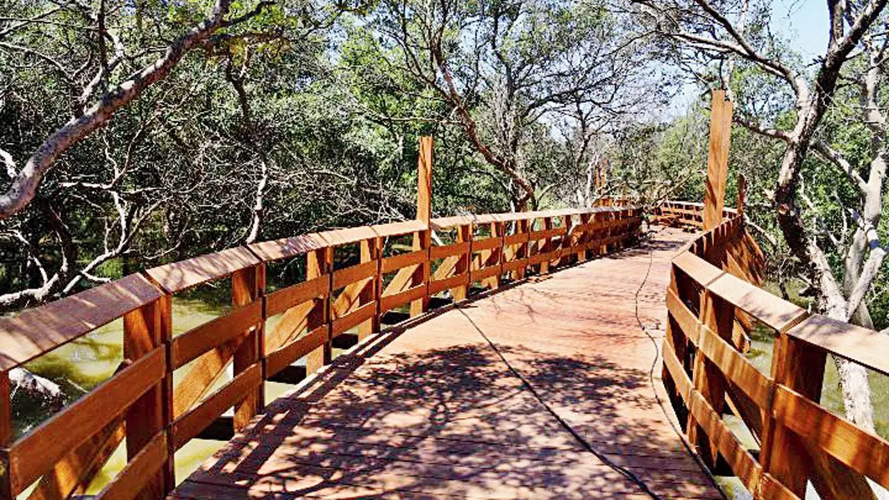 One of the park’s most distinctive features is a 750-metre-long elevated wooden boardwalk. Constructed using eco-sensitive materials and techniques that minimise disruption to the fragile wetland ecosystem, the walkway snakes through dense mangrove clusters and ends at a scenic deck overlooking the creek. The design draws inspiration from Mumbai’s Malabar Hill Skywalk but is adapted for a natural habitat, creating a rare opportunity for visitors to interact with a living coastal forest without harming it.In addition to this immersive nature trail, the park will feature an 18-metre-high watchtower, ideal for birdwatchers and photographers. The area is known to host several species of migratory and local birds, making the park a potential hotspot for urban wildlife enthusiasts and researchers alike.
